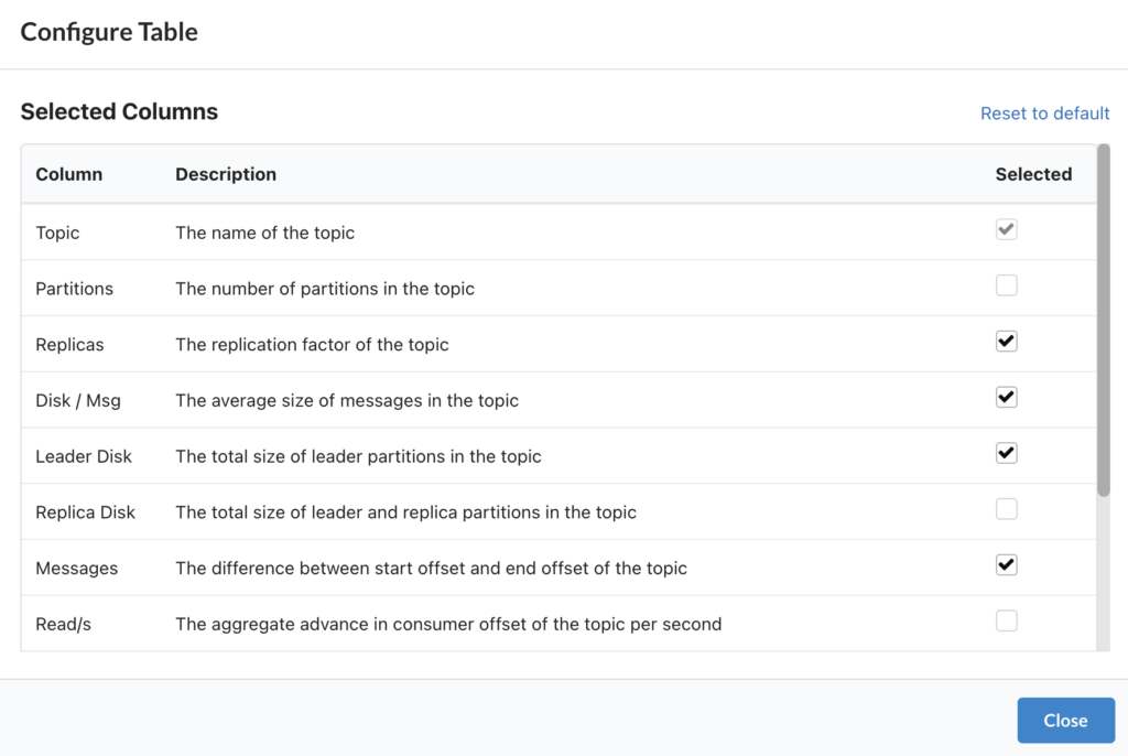 As we introduce even more power to the Kpow UI, some of the tabular data has become a little crowded - so now you can choose the columns to display for each table, and see a simple description of what each column represents.