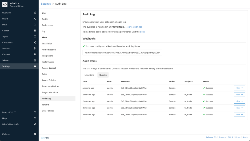 Data Inspect queries are now recoded in the Kpow Audit Log.
